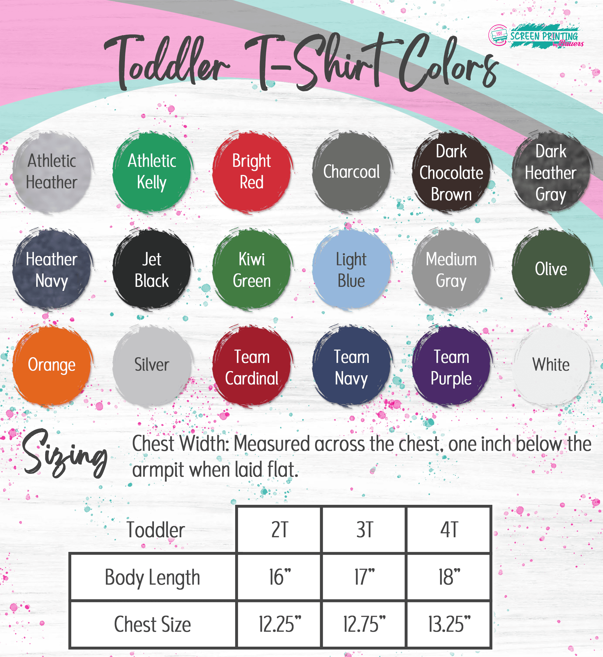 Sizing 2T – 4T. If you need a 5T, we recommending looking under the youth category and choosing X-Small. Which is equivalent to a 4/5.